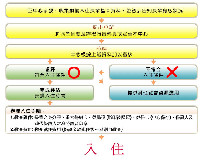 需設籍本國,且無法定傳染病、精神疾病、或開放性肺結核、性病等者。且需有法定親屬委任本中心代為照護者。(公費就養者由地方主管機關出具委託書)。